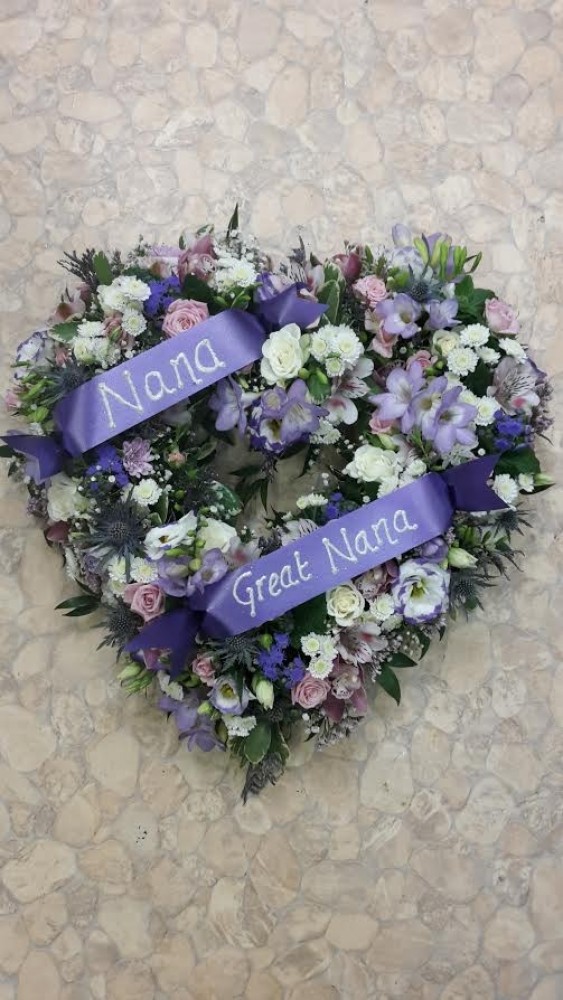 A beautiful Nana open heart tribute. Call us for more information on T: 01948 661111 for more information on this product for sizes, flowers and prices.